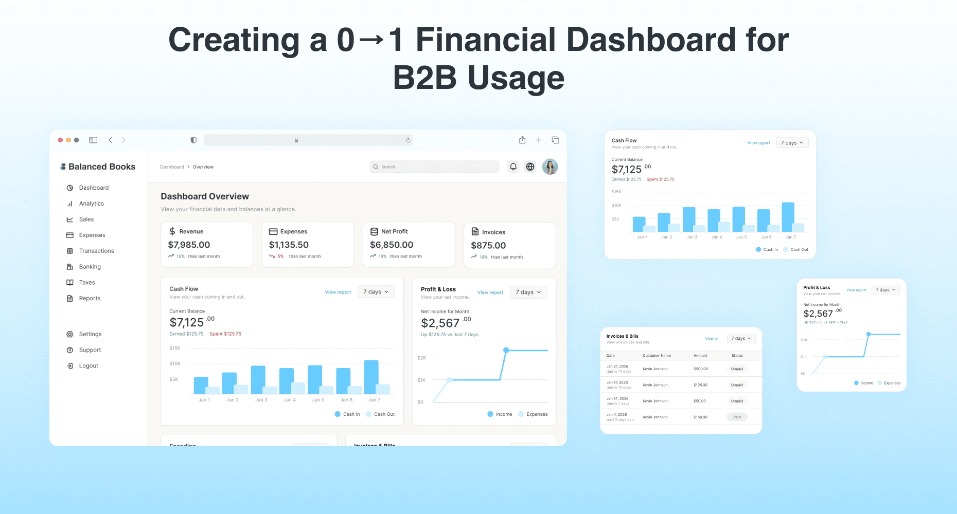 Creating a 0→1 Financial Dashboard for B2B Users by utilizing widgets with key financial metrics and an intuitive user interface. For this case study, I will be focusing only on the home dashboard.