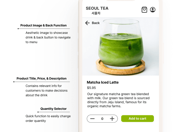 User feedback shows that users like to see an aesthetic picture of the drink they are getting as well as where their tea is being sourced from, so a clear product image and region were included in the details. The quantity selector was also designed to be very minimal and clear when adjusting the quantity.