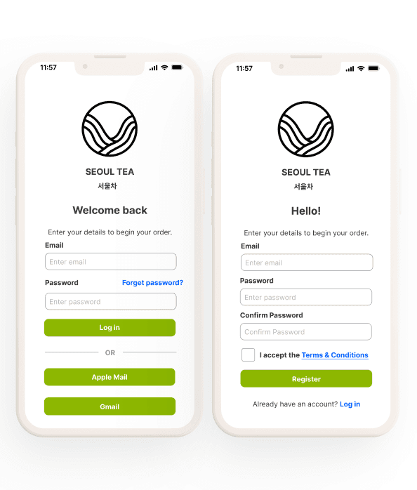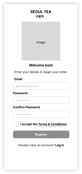 For the login screens, I decided to add in common alternative methods for signing in to give users more options. To clarify users are on the Seoul Tea app, I added in brand details like the name and a logo image.