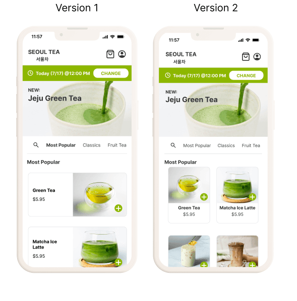 There were two design iterations for the main menu: (1) using a wide length rectangular product card and (2) a narrow rectangular product card. Between the two variations, the narrow rectangular card allowed for more of the drinks to be seen quickly when a user browses the menu. I wanted to get a visual comparison of how the product details would look like between them and see if having short descriptions would be visually appealing. I also added a submenu bar with common tea categories for users to easily search for their preferred drinks.